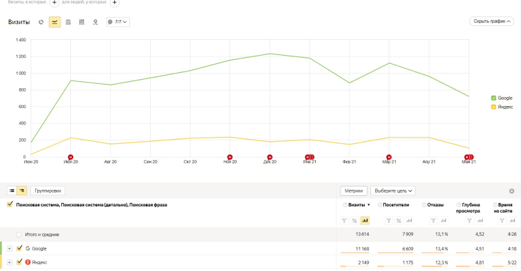 Интернет-магазин был размещен в Яндекс.Вебмастере и Google Search Console. В результате проверки позиций получилось следующее: