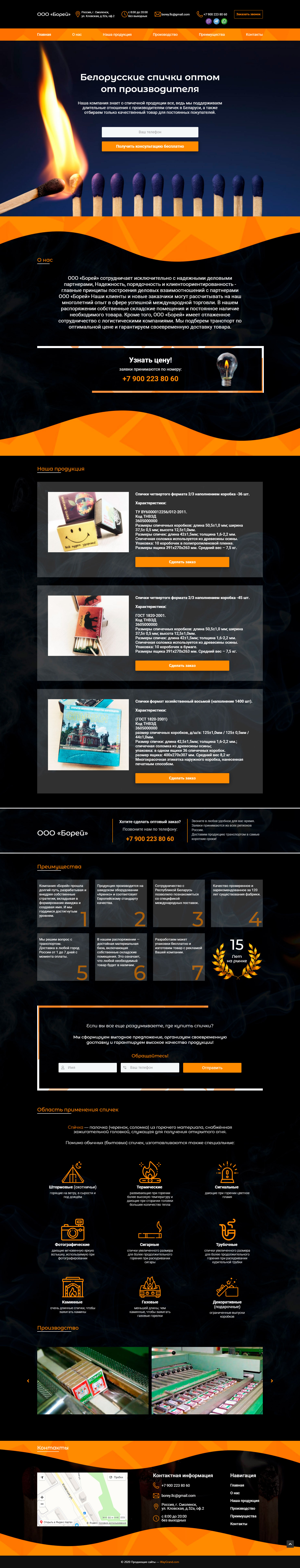 Закажите готовый продающий сайт лендинг #115 в Волгограде за 1-3 дня «под ключ»: свёрстан, отрисован и готов к рекламе. Тематика шаблона «Белорусские спички оптом от производителя».